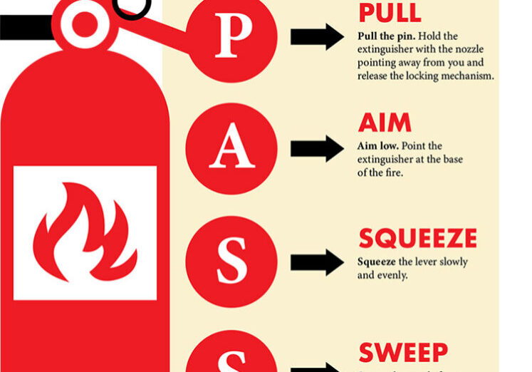 When operating a fire extinguisher, remember the word PASS. PULLPull the pin. Hold the extinguisher with the nozzle pointing away from you and release the locking mechanism. AIMAim low. Point...